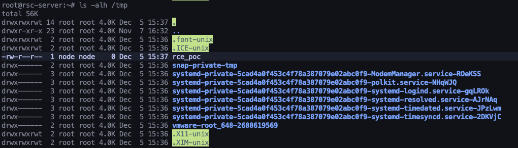 We can observe that the node process created the rce_poc file in the /tmp directory. This indicates the server executed the payload.
