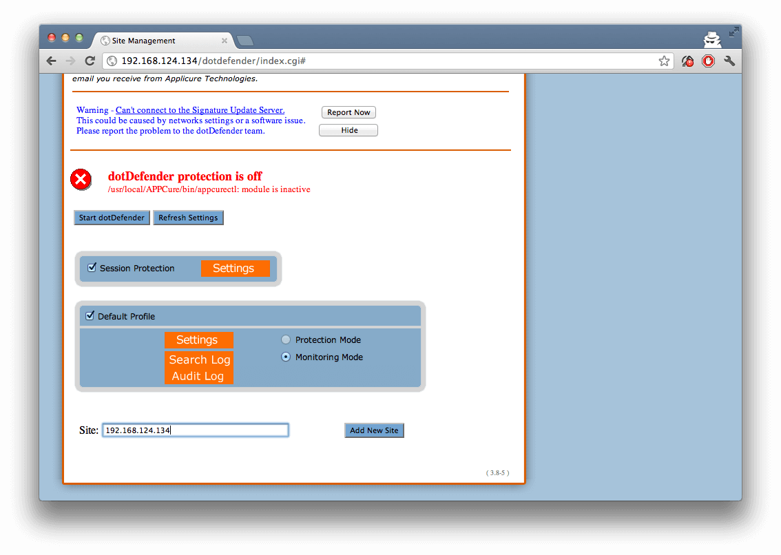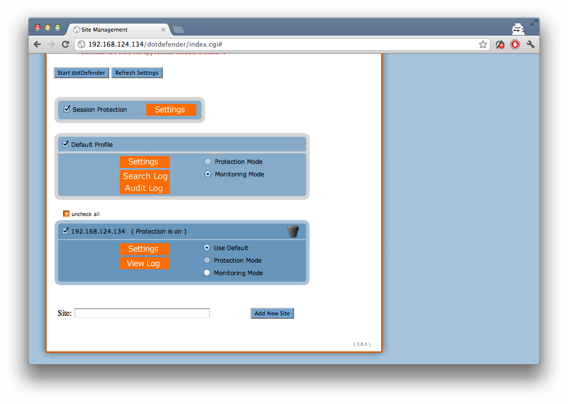 Now we have to add the site to dotDefender. This will be the IP of Metasploitable. Then select “Add New Site”.