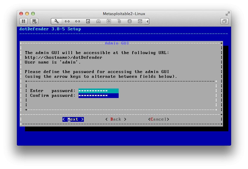 Here we must enter the password we would like to use for the dotDefender Administration GUI. Once we are finished we can select “Next”.