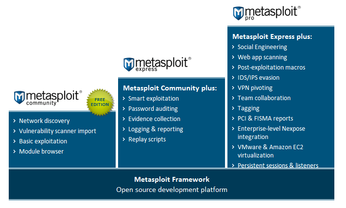 a11y.text What About Metasploit Pro?As the name suggests, this is the commercial version of Metasploit and requires a valid license. The difference between Metasploit Community Edition and Metasploit Pro can be best illustrated by the following diagram: