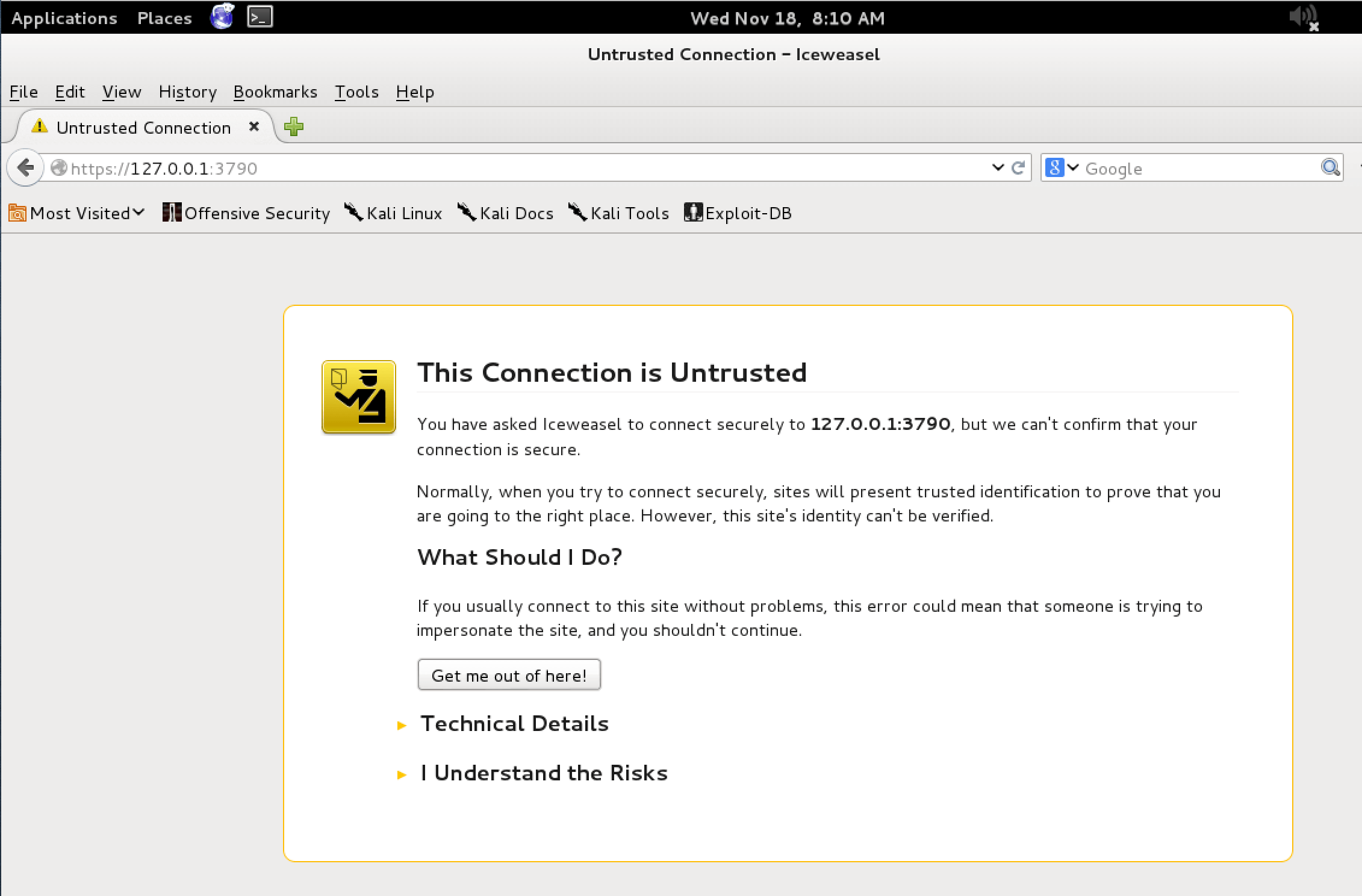 - First, let us access the web interface by going to http://localhost:3790. Disregard the warning about the SSL certificate.