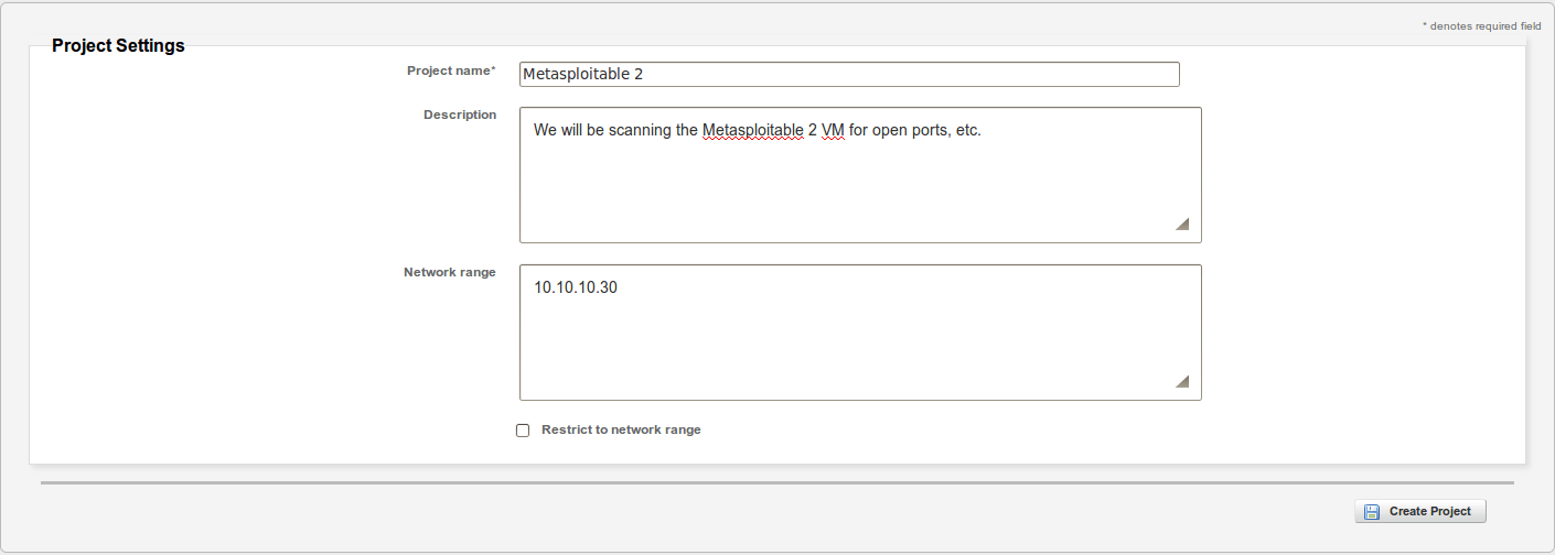 - Please note that we are only required to provide a ‘Project Name’, but we will also provide the ‘Description’ and ‘Network Range’ as follows: