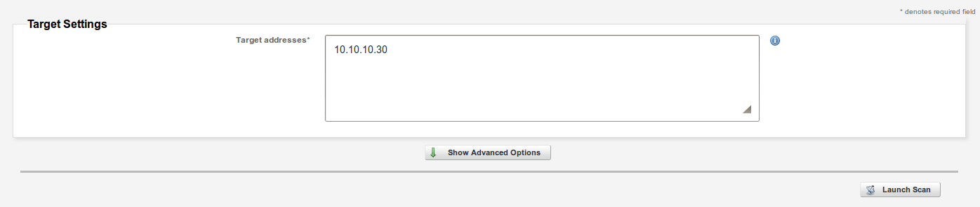 - Confirm IP address range being scanned, configure advanced options such as hosts to exclude or special NMAP switches, and then click on ‘Launch Scan’ when ready:
