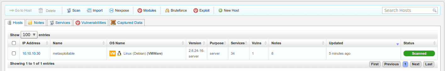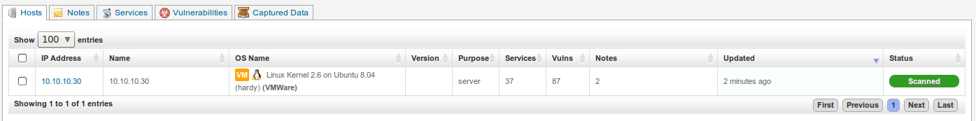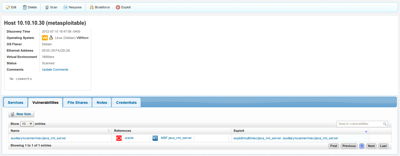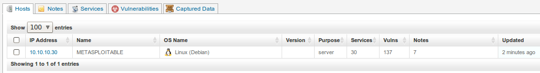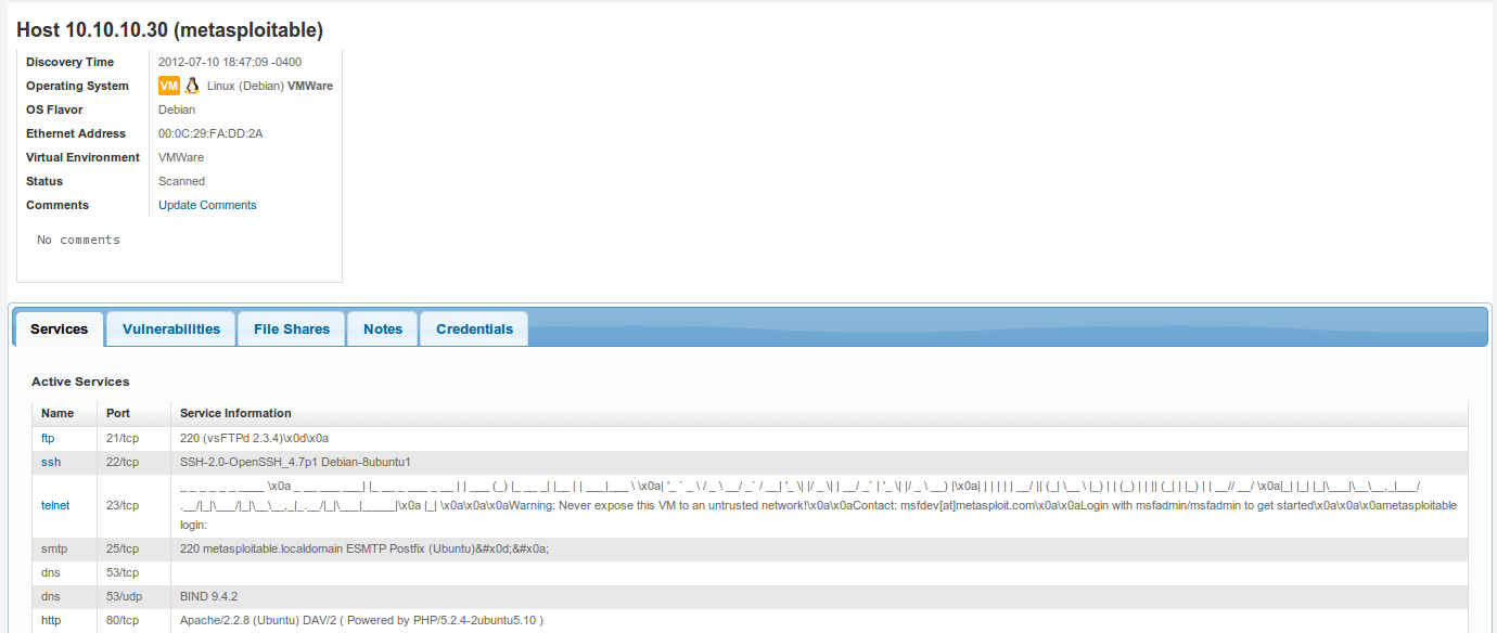 - Clicking on the host or IP address displays additional information about the host such as the list of open ports, service information, and so forth. Notice that you have additional tabs such as ‘Vulnerabilities’, ‘File Shares’, ‘Notes’, and ‘Credentials’. Clicking on each tab provides additional information that may be useful during a penetration test.