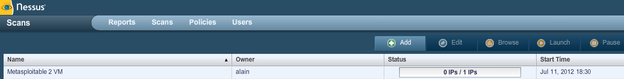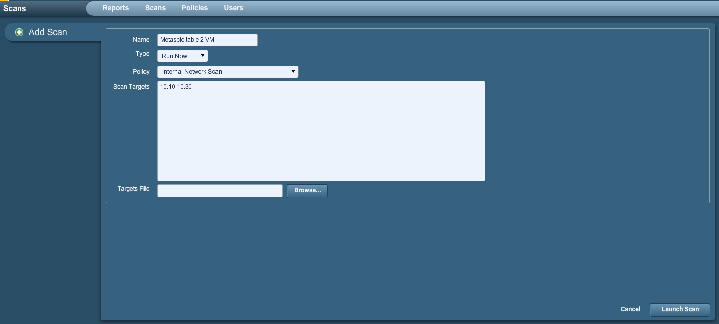 Open your browser to https://127.0.0.1:8834 simply click on ‘Scan’ and then on ‘Add’ as follows: