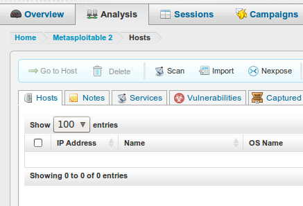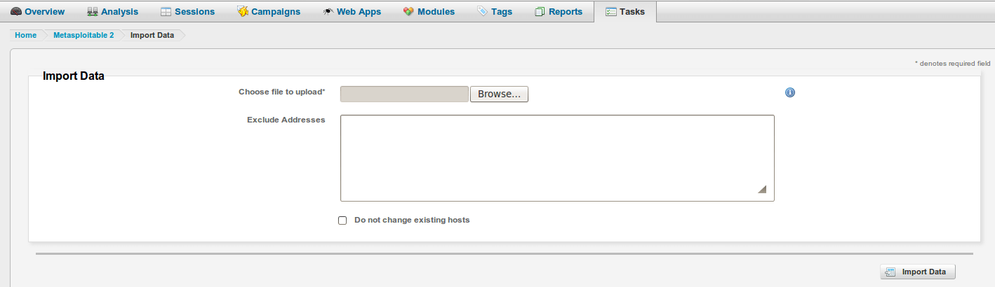 - We now turn to the Metasploit Community Edition web interface. Let us click on ‘Analysis’ and then on ‘Import’ as follows: