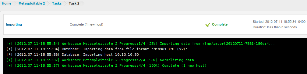 - Data import process is then started, and all data is imported into the Metasploit Community Edition.