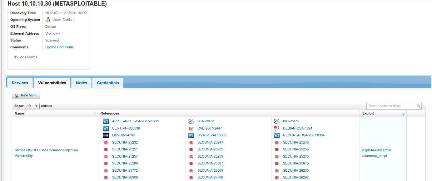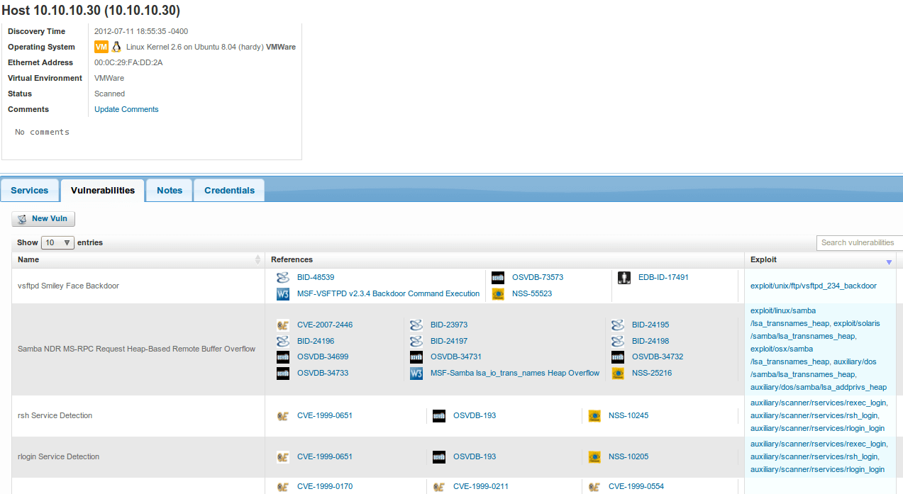 - Let’s click on the host or IP address in order to obtain more information. Notice how clicking on the ‘Vulnerabilities’ tab displays all vulnerabilities associated with this host including CVEs and applicable exploits. Isn’t this amazing?