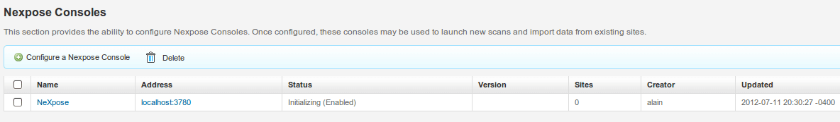 - Scroll down and click on ‘Configure a NeXpose Console’ as follows: