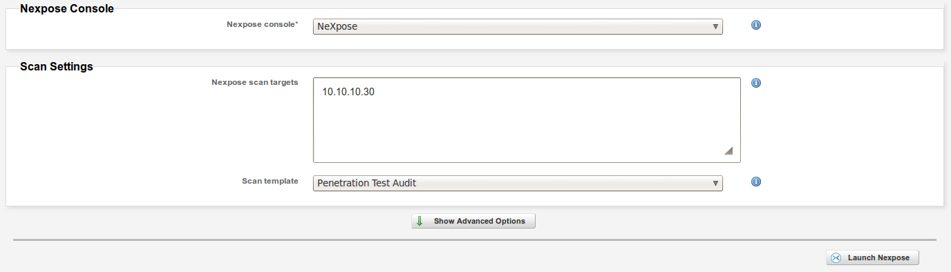 - Select the appropriate Console, the Target Range, Scan Template and Advanced Options, and when you are ready click on ‘Launch Nexpose’ as follows: